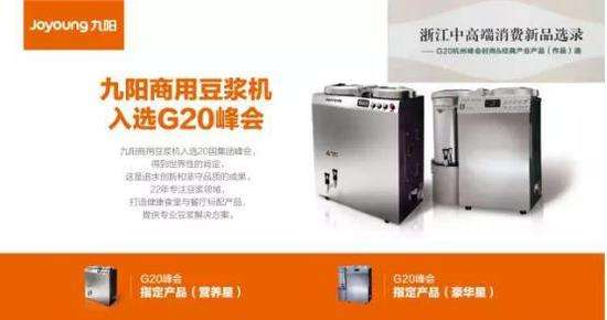 在杭州召开的G20峰会上,九阳商用豆浆机入选G20峰会食品加工类产品序列,成为会议用餐豆浆供应商。九阳商用豆浆机始终坚持“助力社会餐饮、为顾客提供一杯好豆浆”的使命,将持续专注于豆浆设备工艺的改进创新,打造健康食堂与餐厅标配产品,帮助国人全面补充营养,为华人健康助力。