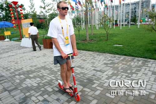 8月1日,两位外国运动员惬意地骑踏板车穿梭在奥运村中,免去了步行之累。中广网记者邱翔 曹囡囡 摄