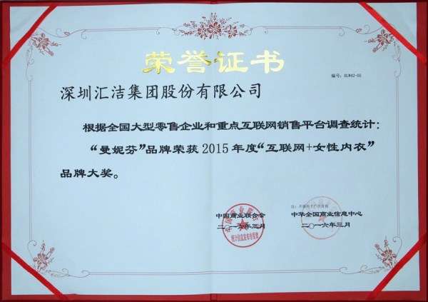 ”品牌内衣也荣获2015年度“互联网+女性内衣”品牌大奖。