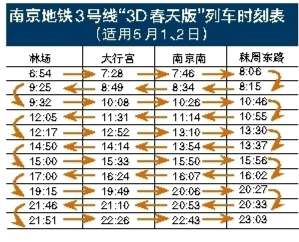 备注:本表选取了该趟列车在林场、大行宫、南京南、秣周东路4个代表站点的时间(仅供参考),请根据列车前进方向提前3分钟至相关站点的站台等待,若有临时调整会在南京地铁官方微博上另行通知。