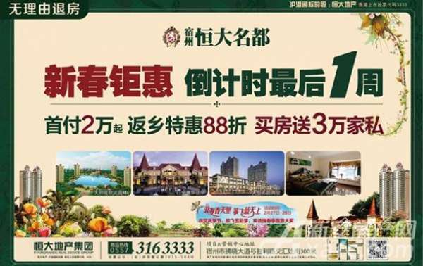 恒大名都新春钜惠,倒计时最后一周!购房特惠88折,买房即送3万品牌家私券!80-140㎡湖景豪邸,享1500元/㎡优惠,拎包入住0负担!看得见的品质,摸得到的实惠,高性价比好房不容等候,钜惠风暴势不可挡,行动起来吧,置业就在此时,错过就是罪过!