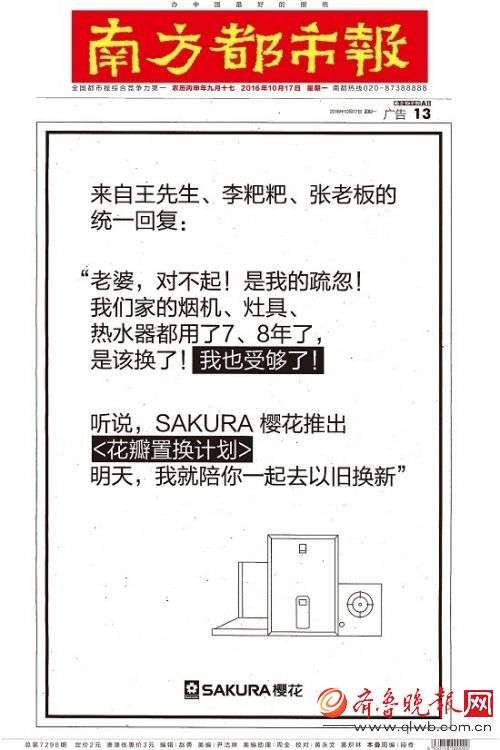 齐鲁晚报济南10月19日讯:“呦,原来是以旧换新广告啊。”10月17日,《南方都市报》上“吐槽”广告答案揭晓,网友们终于恍然大悟:原来这是SAKURA樱花(樱花卫厨(中国)股份有限公司简称SAKURA樱花)玩的一次创意广告!