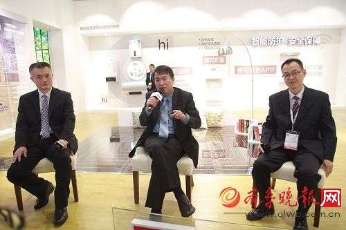 SAKURA樱花总经理黄耀庆(中)、整体厨房副总沈铭中(左一)、营业处总监孙保奇(右一)接受媒体采访