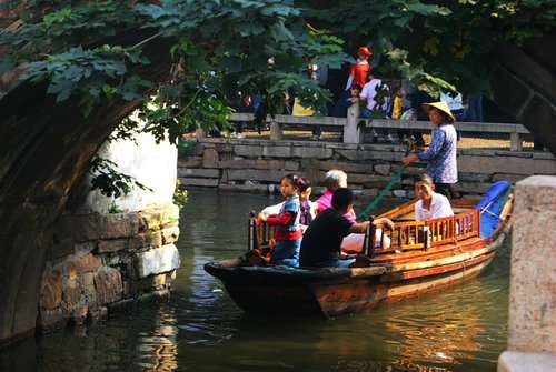 坐在周庄悠悠荡荡的小船上,抬头捕捉烟雨蒙蒙的石桥景象,河上无处看不见小舟。在周庄河水的柔波上乘船,小船在周庄的河水上左右摇晃,初坐时每一刻都有倾倒的感觉,坐得久了仿佛在母亲的摇篮中,轻轻的水波温柔地抚摸着小船,很容易把我们带到儿时甜甜的梦里。
