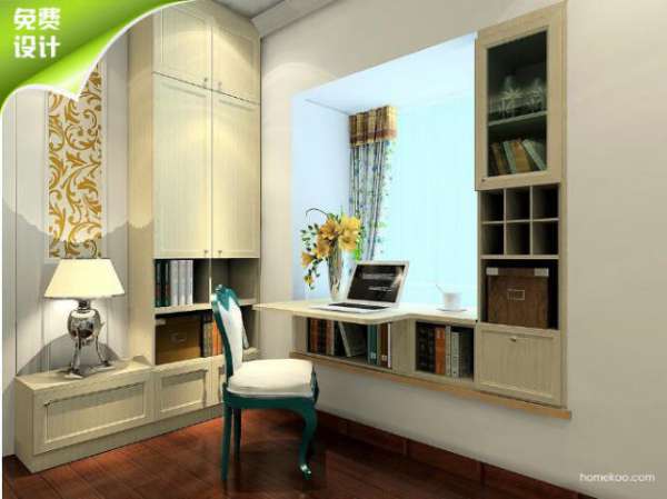 窗边的角落位也不能浪费,与书桌和搁板组合,让小房间也能有一个舒适的工作区。