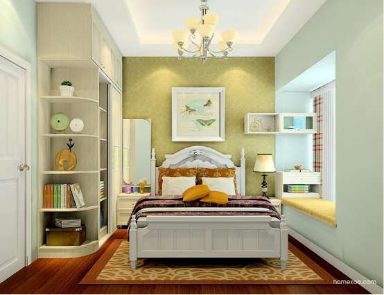 小卧室的设计收纳空间的营造是重点,衣柜圆弧置顶的设计,为这个小卧室量身定制了一个大衣柜。欧式床品搭上舒适飘窗,空间显得十分温馨。