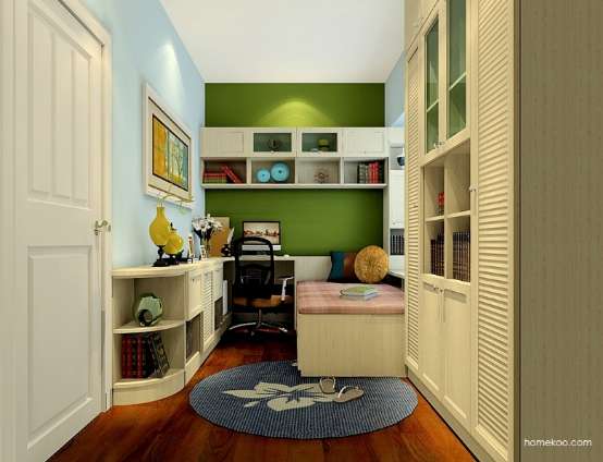 尚品宅配提心您:榻榻米+飘窗+书柜一体设计,最大限度发觉空间爱你新领域,打造实用的小客卧空间。同时利用转角书桌+吊柜组合,在这个小小的空间里开辟出书房领域,工主人和平日在家办公及阅读时实用。