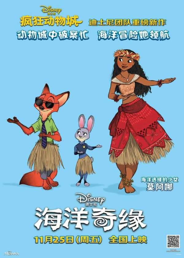 由中影/华夏发行、迪士尼动画工作室制作、迪士尼影业出品,《疯狂动物城》、《超能陆战队》、《冰雪奇缘》原班人马打造的动画冒险喜剧《海洋奇缘》(Moana)将于11月25日中美同步公映。