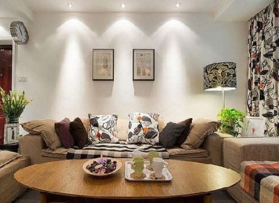 客厅沙发、茶几,灯光营造的氛围,客厅里的吊灯还没有开,周围装了很多小射灯,沙发背景很简单,两幅挂画,既省钱又有美感。