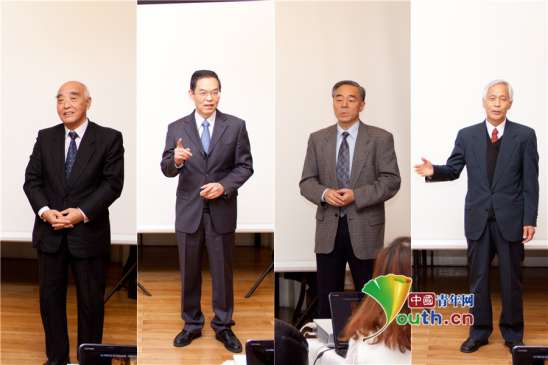 中国四位前驻哥伦比亚大使吴长胜(左一),李长华(左二),高正月(右一),汪晓源(右二)与现场青少年分享担任驻哥伦比亚大使期间的工作感触。中国青年网特约记者 王晨曦摄