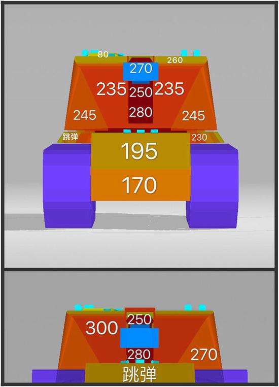 等效如图,正面基本免疫低级车的银币弹了,首上不怕59,炮塔上大斜坡的时候可以防基佬十和300穿,一般情况下卖头可以防250左右的穿深,还是算不错的头的,八级MT除了个别的金币弹也能扛住,不过面对高穿深还是怂一怂吧,毕竟1400的HP还是很宝贵的