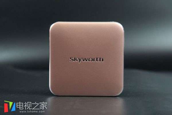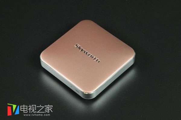 创维盒子A5外观创新性的将科学与艺术结合,整体外观采用圆角矩形经典设计,金属喷漆外壳,103mmx103mmx23mm的精巧设计,重量约为0.7KG,小巧的身段还是比较有分量的,握在手上沉甸甸的,拥有香槟金、玫瑰金、少女粉、钛黑四种主流色彩供选择。