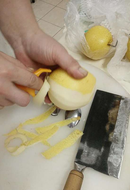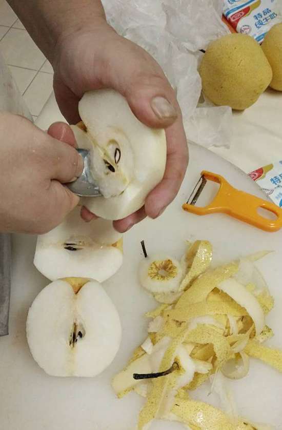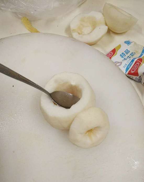 将雪梨从三分之一处切开,并且掏空内部