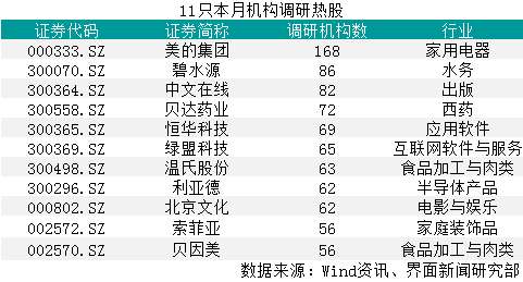 (300364.SZ)成为本月获得机构调研频次最多的三家上市公司,其本月机构调研的数量分别为168家、86家、82家。值得一提的是,美的集团的机构调研会议吸引了上百家外资机构的参与。