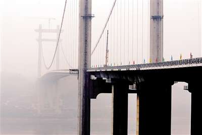 技术工人对大桥拉索钢缆进行封胶防锈处理。雾中的寸滩长江大桥犹如一条见首不见尾的神龙。航拍寸滩长江大桥北岸。作为主城区第27座特...