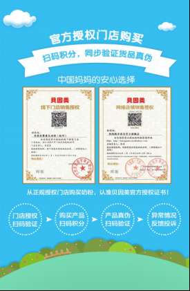 为了防范不良商家的授权书作假,消费者可通过手机扫码的方式,确认这家门店是否是贝因美官方授权点,而且还可以查看贝因美授权店的地址、授权的产品类型、销售价格和负责人等信息。购买贝因美奶粉之后,还能够获得会员充值积分。也就是说,根据这些方法,就能够有效的规避宝妈购买到假冒的贝因美奶粉。