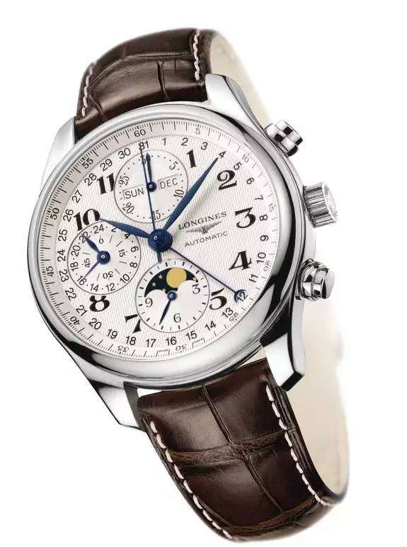 浪琴表作为一个传统钟表制造商,自公司创立开始便生产了许多卓越的时计。浪琴表名匠系列腕表是品牌精神的完美体现,自2005年问世起便取得了巨大的成功。这款计时码表直径40毫米,配备自动上链机械机芯。压印有大麦颗粒图纹的银色表盘搭配俊朗的蓝钢指针,优雅地烘托出月相显示功能。该款腕表搭配棕色短吻鳄鱼皮表带。