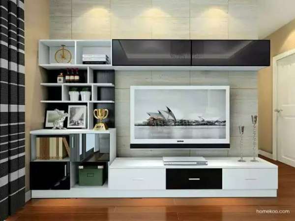 不喜欢复杂设计的,可以尝试简单的黑白搭配,左边不规则分柜设计增添客厅亮点。