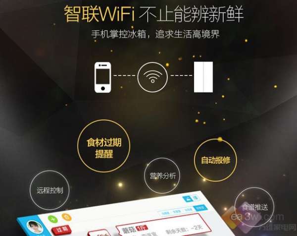 冰箱支持远程操控,手机在手,智能生活随时有。通过下载智能APP,时时享受异地操控,支持食材过期提醒、选择模式、食品推荐、健康体检和自动保修功能。