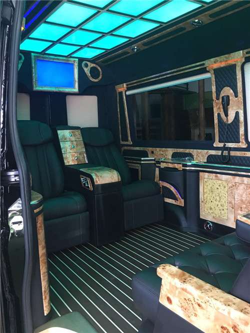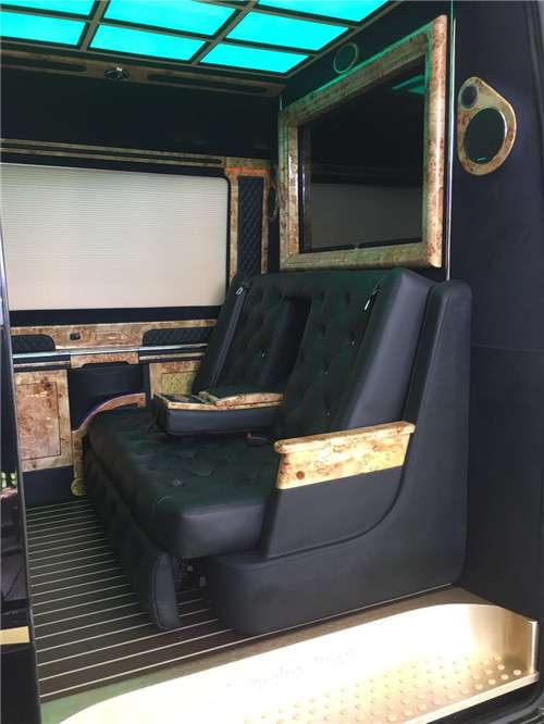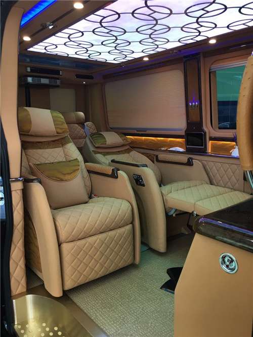 细节方面:奔驰斯宾特殿堂式的阶梯门非常的尊贵,试问有谁坐车不用弯腰的,只有奔驰斯宾特能做到。 仪表盘及门饰板真皮包覆,前舱纯手工羊毛地毯及脚垫,全车NAPPA真皮航空座椅(带旋转),全车柚木地板及脚踏板,BOSE135家庭影院系统,星空式车顶,纯实木气撑小桌板,不锈钢挂衣杆真皮包覆,车载专用大容量冷藏箱,电动升降32寸液晶电视一台,电动遥控窗帘等,各种豪华配置集于一身。
