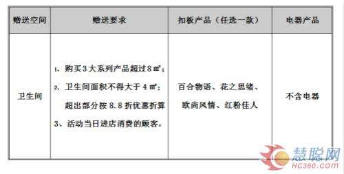 凡在活动当日进店购买魔方组合、玲珑系列、五行系列三大系列新品之一,并用于超过面积8?吊顶的顾客,皆可享受免费赠送的不超过4?的卫生间吊顶产品: