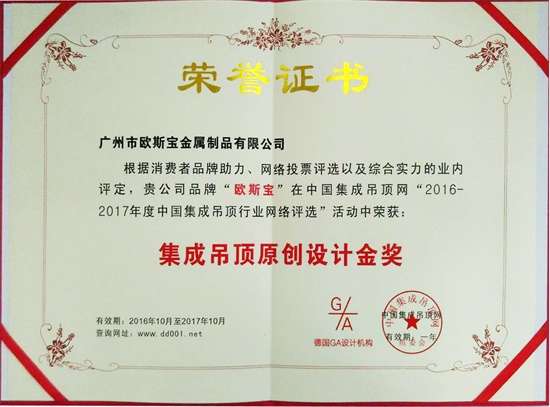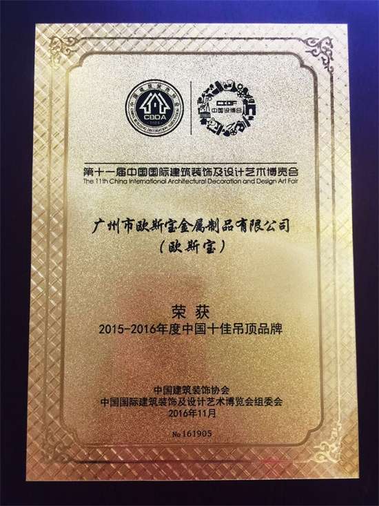 由中国国际建筑装饰及设计艺术博览会评选的“2015-2016年度中国十佳吊顶品牌”,充分见证了欧斯宝品牌获得的权威认可。