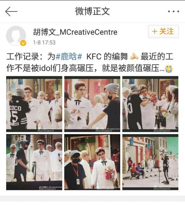 微博原文:“工作记录:为#鹿晗# KFC 的编舞 [作揖] 最近的工作不是被idol们身高碾压,就是被颜值碾压…[泪]”