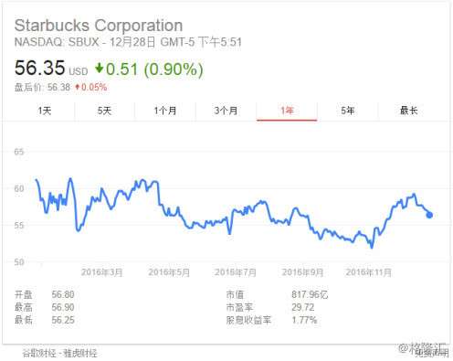 如果你是股息投资者,入手星巴克不会让你失望。在这里,我不可能违心地跟你打包票说目前是星巴克股价的低谷,也不敢保证去年不及市场的表示是为了来年或者2018年的一飞冲天。因为短期,市场先生可能不是很理智也不能被预测。但我很信任星巴克的管理层,他们未来几年的计划,足以保证企业的增长,随之,即使股价不涨,股息也会增长,长远来看蕴藏着不小的回报。