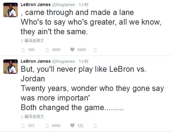 “但是,你们永远看不到勒布朗和乔丹对决的场面。20年后,很想知道他们会认为谁更加重要。两个人(乔丹和詹姆斯)都改变了比赛,经历了许多之后取得成功,并且走出了一条道路。谁能说他俩之间谁更加伟大,我们所知道的是,他们不是同一类型的球员。”詹姆斯在推特上这样写道。