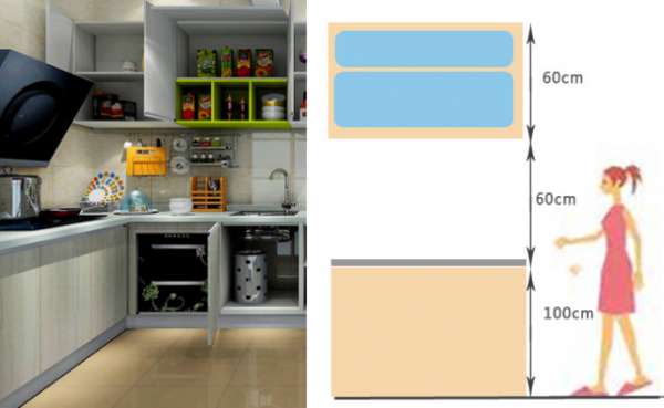 从操作台到吊柜的底部,确保有60cm!这样方便烹饪,还可以在吊柜里放一些小型家用电器。