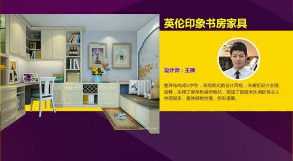 尚品宅配设计团队案例3:整体布局成U字型,采用欧式的设计风格,书桌柜设计合理、独特,采用了展示柜展示物品,增加了榻榻米休闲区供主人休闲娱乐,整体储物性强,色彩温馨。