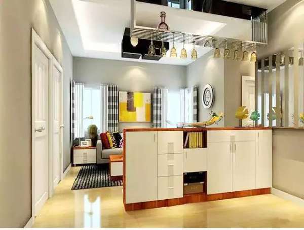 ①对于采光需求比较严格的家庭而言,在客厅区域定制一个隔断柜,但是柜体上方不要再设柜体即可,这样就不会阻挡光线。 ② 简易的吧台立于客厅与餐厅之间,根据需要设置酒格或书架。