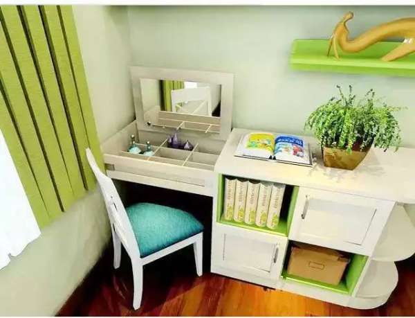 这款定制的桌子往上一翻瞬间变成了梳妆台,而且内部空间分成了9格,可以收纳耳环,项链,墨镜,化妆品等物品,另外这张桌子平常也可以用来学习办公使用哦!