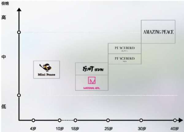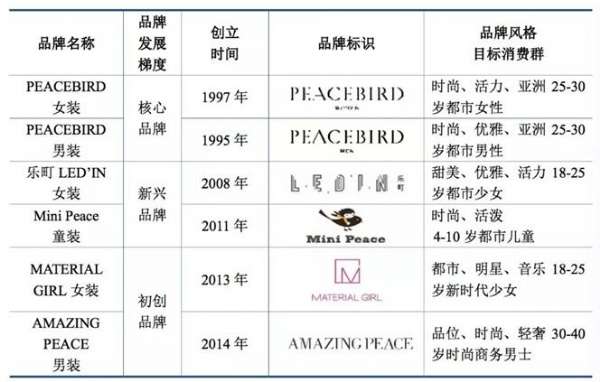 目前,太平鸟的品牌集群中共有6个品牌,以品牌发展阶段分为三种类型的品牌,分别是:核心品牌PEACEBIRD男装、PEACEBIRD 女装 ;新兴品牌乐町LED’IN、Mini Peace;初创品牌Material Girl 女装、Amazing Peace男装。