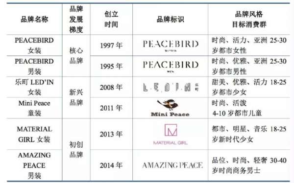 目前,太平鸟的品牌集群中共有6个品牌,以品牌发展阶段分为三种类型的品牌,分别是:核心品牌PEACEBIRD男装、PEACEBIRD女装;新兴品牌乐町LED’IN、Mini Peace;初创品牌Material Girl 女装、Amazing Peace男装。