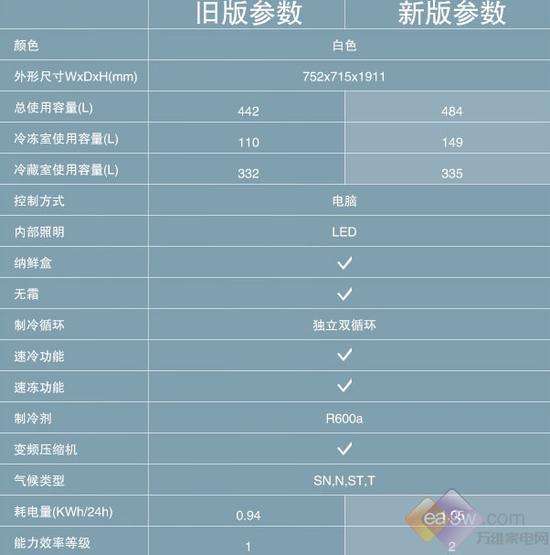 冰箱拥有484升大容量,其中冷藏室335升,冷冻室149升,可全方位满足大量食材的保鲜需求。