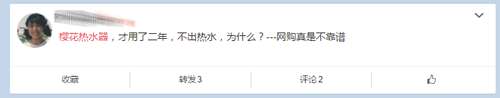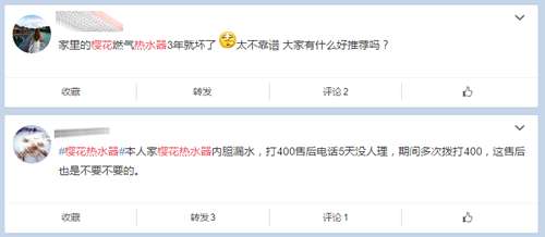 有位名叫“我就是我”的网友在网络上留言称,他家已经买了樱花卫厨的热水器九年了,樱花卫厨真是垃圾!九年来家里修热水器维修次数数都数不清,一次五百,一年最起码两到三次,每年一到冬天都坏掉。这一次,他终于忍不住爆发了。在进入浴室以后衣服脱好了,等热水,热水器的打火石就坏了,不能出水。家里硬着头皮修热水器,但是怎么维修都维修不好。今天家里下雪了,同样准备洗澡,然后热水器又坏了,我就冷冷的从水里出来,等烧水,寒冷的冬天让这个人哆哆嗦嗦,而不作为的维修才真正让消费者心寒。据悉,这款热水器在在一家名为“五星”的点买的,之后不知道什么原因就搬到什么地方去了。多次叫维修上门维修修不好,可想而知这位消费者心情有多烦躁。另一位网友表示,樱花热水器才用2年,就不出热水,为什么?还有一位网友也称家里的樱花热水器3年就坏了,太不靠谱!
