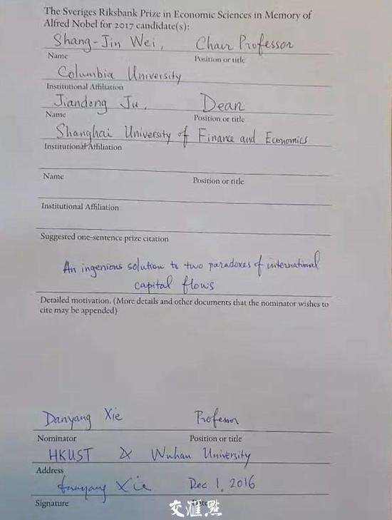 获得诺贝尔经济学奖提名是拿到诺贝尔奖第一步。据知情人士透露,每年有大约1000至2000名左右的全球知名人士有提名权,在12月份开始进行提名,提名鞠建东的为香港科技大学、武汉大学谢丹阳教授。