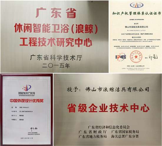 目前,浪鲸卫浴共拥有国际发明专利1项,国家发明专利30项、实用新型专利56项、外观专利424项。同时,品牌产品玛格丽特系列、鲸鱼缸凭借过硬的技术和出色的设计,获得了「中国专利奖外观设计优秀奖」,同时品牌生产基地也先后获得了「广东省工程技术研究中心」、「广东省企业技术中心」、「国家高新技术企业」、「知识产权贯标企业」等殊荣。