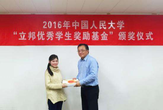 中国人民大学2016年“立邦优秀学生奖励基金”颁奖仪式在人民大学举行,今年共有20名大学生获得了奖励基金。立邦中国建筑涂料事业群副总裁兼公关中心主管孙荣隆为优秀学子授予了基金;中国人民大学