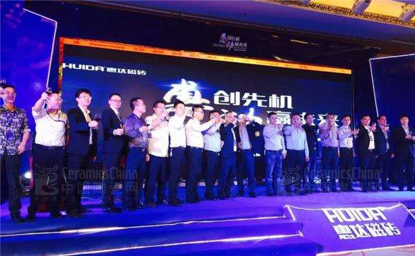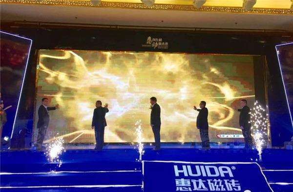 惠达集团副总裁杨春 惠达磁砖营销中心总监严仕杰市场部总监杜晓勇销售总监潘伟和郝春喜共同为”惠创先机,动赢未来”2017年惠达磁砖经销商年会启动开幕仪式。