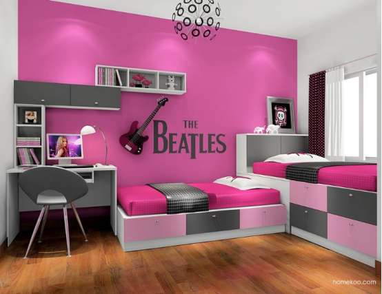这儿童房设计最抢眼莫过于两张床的错落高低拼搭,设计师根据实际需求,布置了有收纳功能的抽屉床,以及书桌单独分开的设计,既充分利用了空间,且不会互相干扰。这套方案是给一对上初中的女孩设计, 张扬的色调搭配,配上摇滚的主题,迎合个性张扬的青春期女孩。