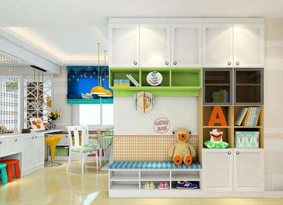 入门鞋柜的设计上综合考虑到了让小朋友学会主动分类以及进门换鞋的好习惯,开放式的鞋柜给小朋友能直观的分类自己的鞋子,鞋柜上面放个垫子,就可以当换鞋凳,父母就可以引导小朋友怎么穿鞋换鞋。