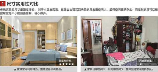 传统家具的尺寸是固定好的,对于小居室而言,往往会出现买回来的家具占用空间大,显得空间拥挤杂乱;而定制家具可以根据居室的大小的自由控制,省心得多。(上面是