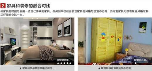 买家具的时候总会挑一些自己喜欢的家具,但买回来往往会发现家具的风格与居室不协调;而定制家具可以跟着居室风格定制,正好能避免这一点,还起到衬托的作用。