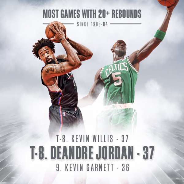 在今日快船主场113-97战胜湖人的比赛中,快船球员德安德鲁-乔丹抢到了21个篮板球,职业生涯第37次至少抢下20个篮板。37次也超越了凯文-加内特的36次,成为了自1983-84赛季以来单场篮板球20+次数并列第8的球员,他与凯文-威利斯同为37次,排在他前面第7的是本-华莱士的42次。