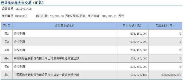 中新经纬客户端1月18日电 据深交所18日披露的大宗交易信息,美的集团1月18日现28.93亿元天量大宗交易,卖方席位全部来自中金公司深圳福华一路证券营业部。买方则多为机构专用席位。