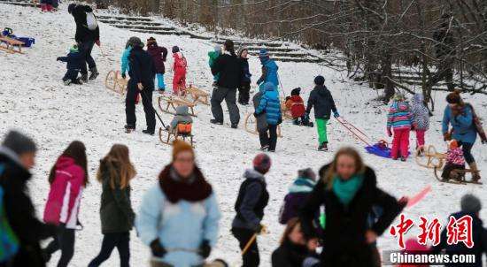 1月8日,德国柏林民众出门玩雪。