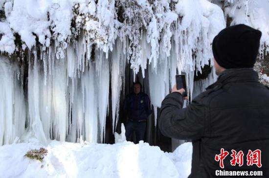 1月8日,科索沃民众在冰瀑前拍照。