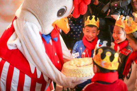 肯德基吉祥物奇奇给1月份过生日的小候鸟们送上生日蛋糕。(新华网 江昆摄)
